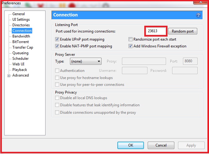 By default, BitTorrent uses a port 23613. You can change port number to any number above 10000. Go to preferences> Connection > see left side of random port. Add any port number above 10000. Click Apply> Ok.
